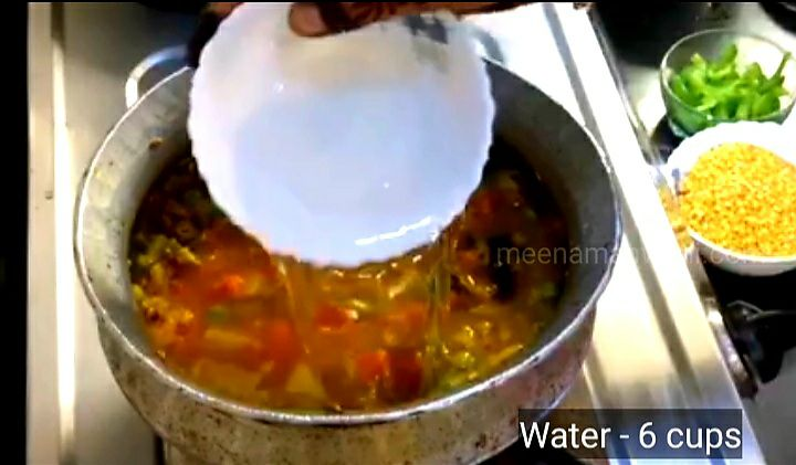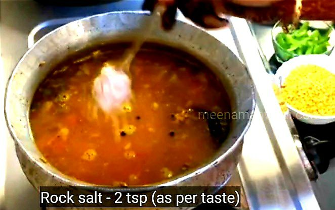 12. अब इसमें 6 कप पानी, और 2 tsp सेंधा नमक डालकर अच्छी तरह मिक्स कर दीजिए।11. ढक्क्न से ढककर इसमें एक उबाल आने दें।