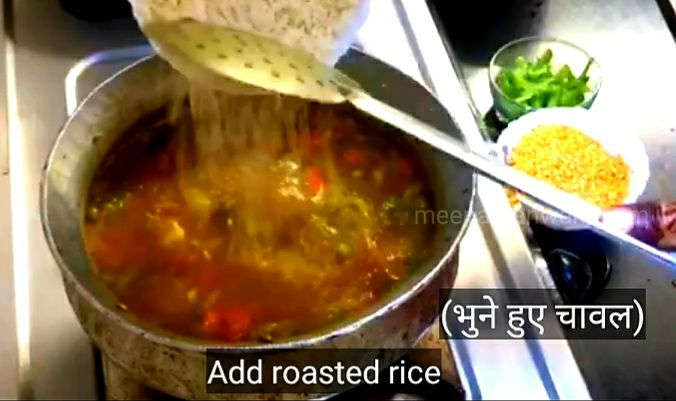 13. भुने हुए चावल और भुनी हुई मूंग दाल और कटी हुई शिमला मिर्च डालकर मिक्स कर दीजिऐ और इसमें एक उबाल आने दें।