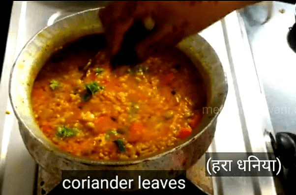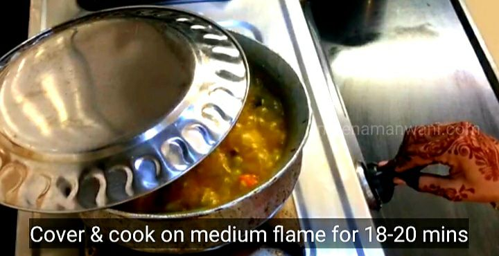 15. जैसे ही खिचड़ी में उबाल आने लगे इसे मध्यम आंच पर उल्टा ढक्कन लगाकर 18 से 20 मिनट तक ढककर पकाए।