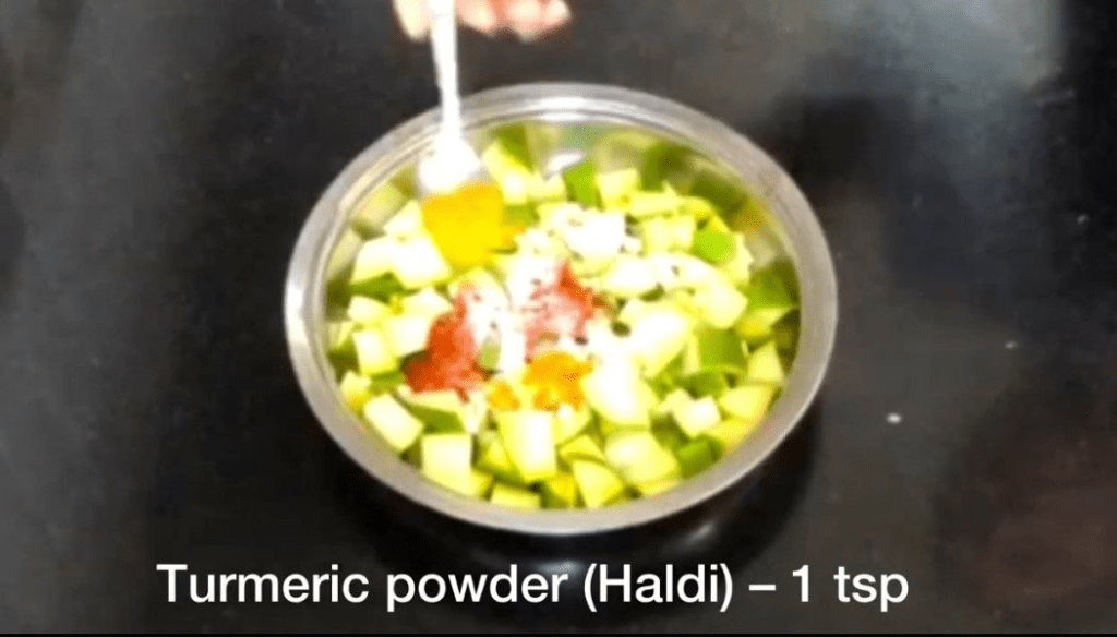 - एक मिक्सिंग बाउल में कटे हुए आम और लहसुन डालें।