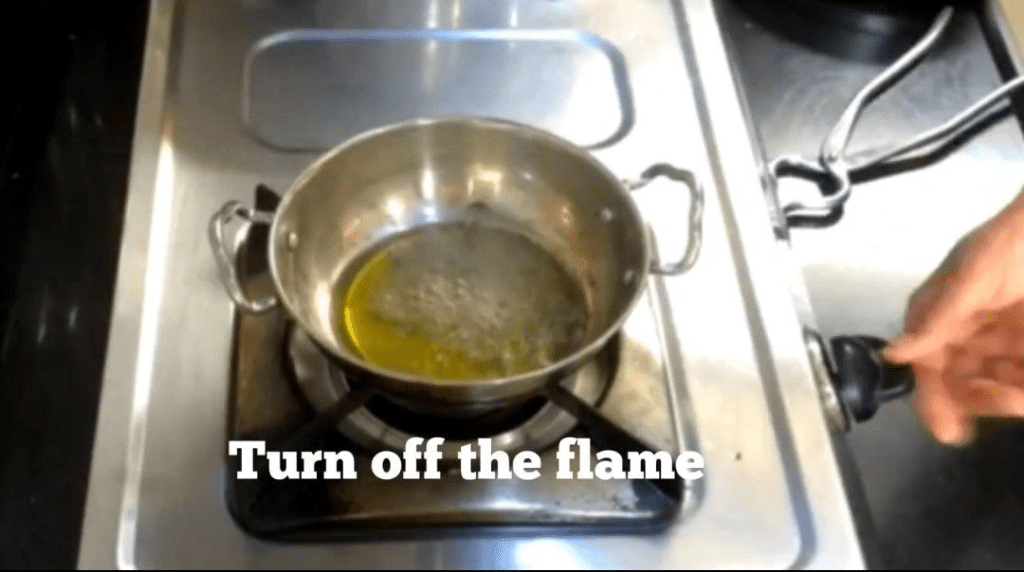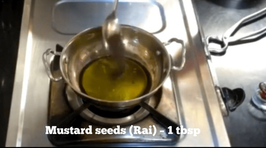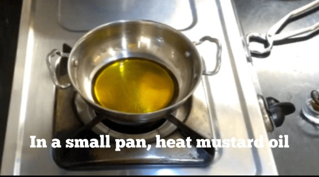 - एक छोटे पैन में सरसों का तेल डालें और उसे धुआं निकलने तक गर्म करें।