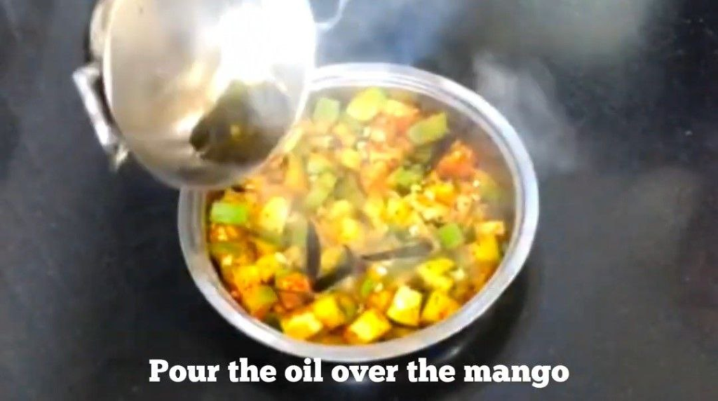 1.यह गरम तड़का सावधानीपूर्वक आम-मसाले के मिश्रण पर डालें।