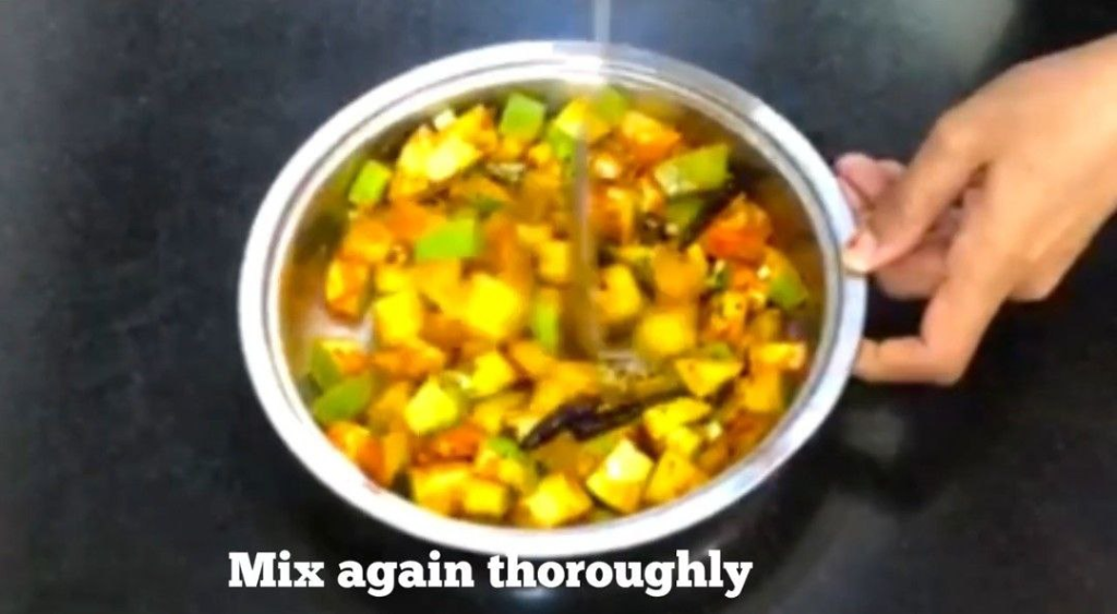 - चम्मच से अच्छी तरह मिलाएं ताकि तेल और तड़का सब जगह फैल जाए।