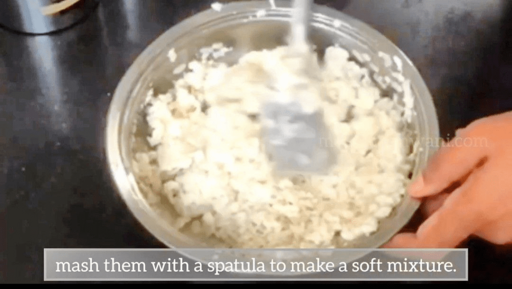 अच्छे से मिक्स करें और स्पैचुला से मसलें ताकि मिक्सचर एकसार हो जाए।