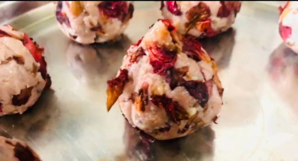 👉 हाँ, छोटे-छोटे लड्डू बनाकर गुलाब की पंखुड़ियों से सजा सकते हैं।
